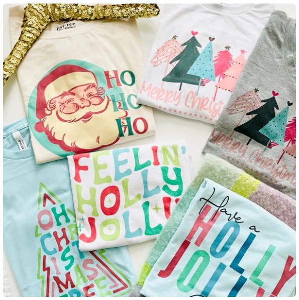 Be the holly jolliest around this holiday season in these festive tees! Choose from 6 cheerful designs on soft shirts with great colors options.