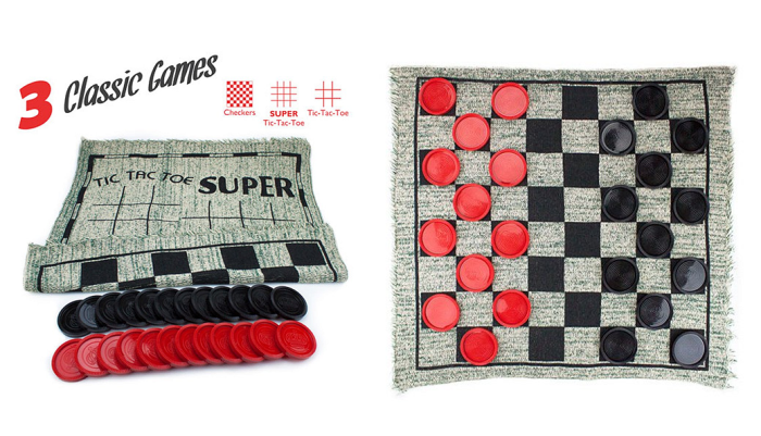 Giant rug checkers was one of my favorite games when we had to stay inside for recess when I was little. So much fun! The reverse side has Super Tic-Tac-Toe and Tic-Tac-Toe, too!