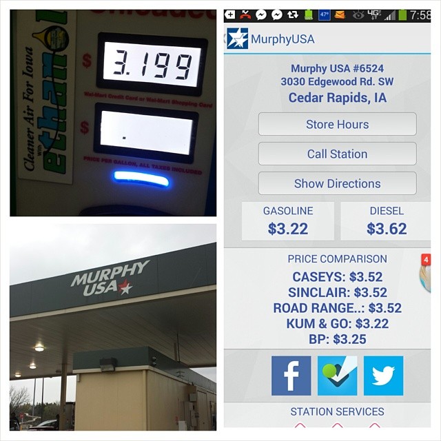 I was driving through Iowa and there was a Crazy good deal in Cedar Rapids! Not only was Murphy USA the lowest price in town, but it was at a Walmart. They offered an extra discount if you used a Walmart card. So I was able to score gas for $3.19 a gallon! Had I chosen to fill up at the first station I saw, I would have paid $3.52/gal. Paying $3.19/gal instead saved me over $15.00 just in one stop! Brilliant!