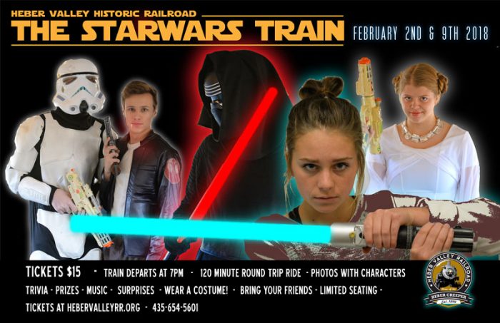 Star Wars fans won’t want to miss the chance to ride The Star Wars Train at the Heber Valley Railroad! Costumes are encouraged, and there will be great photo opportunities with a cast of costumed characters including Chewbacca, Yoda, Rey, Leia, and others! On board, you’ll enjoy Star Wars trivia with prizes, themed music, games and fun!
