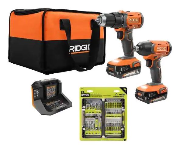 RIDGID 18V Cordless 2-Tool Combo Kit with Batteries, Charger, Bag and Impact Rated Driving Kit (70-Piece) for $89 (Reg $158)!