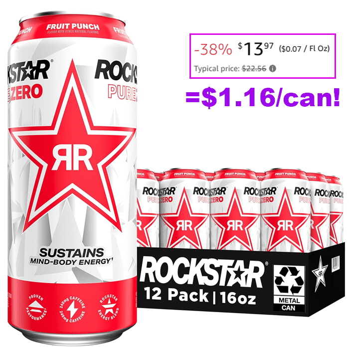 Rockstar Pure Zero Energy Drink, Fruit Punch, 16oz Cans (12 Pack) for $16.44 (Reg $22.56)!