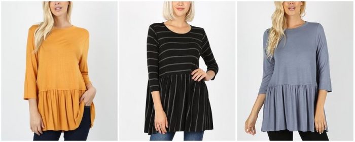 These flowy 3/4 sleeve tunics come in a variety of colors in sizes S-3X.