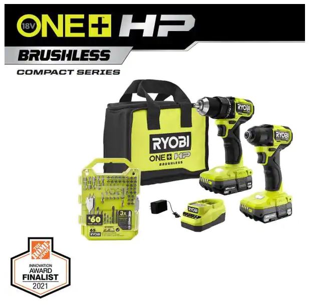 RYOBI ONE+ HP 18V Brushless Cordless Compact 2-Tool Combo Kit w/Drill, Impact Driver, Batteries, Charger, Bag, & 65PC Bit Set for $129 (Reg $200.97)!