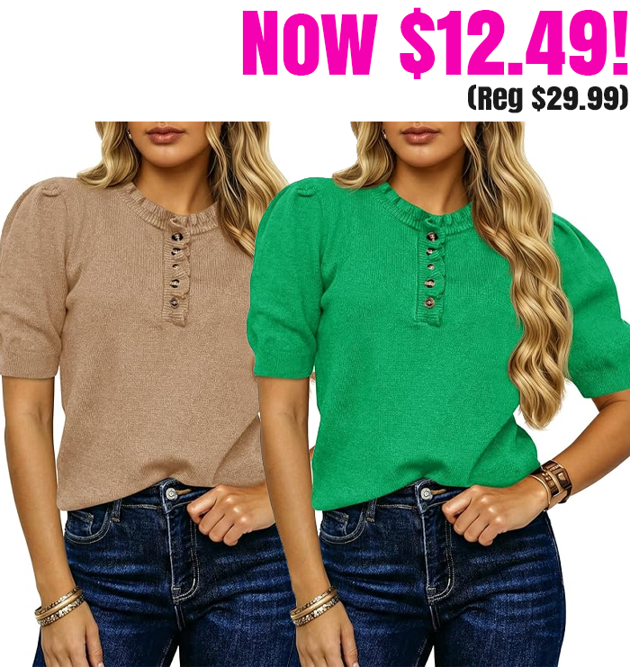 Saodimallsu Ruffle Crew Neck Button Up Puff Short Sleeve Sweater for $24.99 (Reg $29.99)!