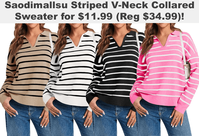 Saodimallsu Striped V-Neck Collared Sweater for $23.99 (Reg $34.99)