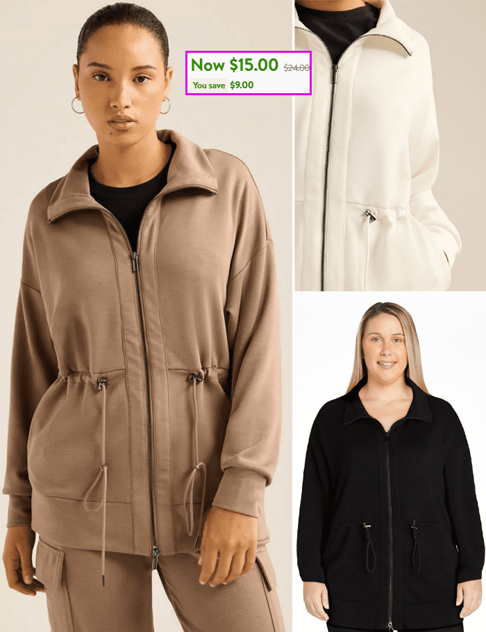 Scoop Ultimate ScubaKnit Longline Drawstring Zip Jacket for $15 (Reg $24)!