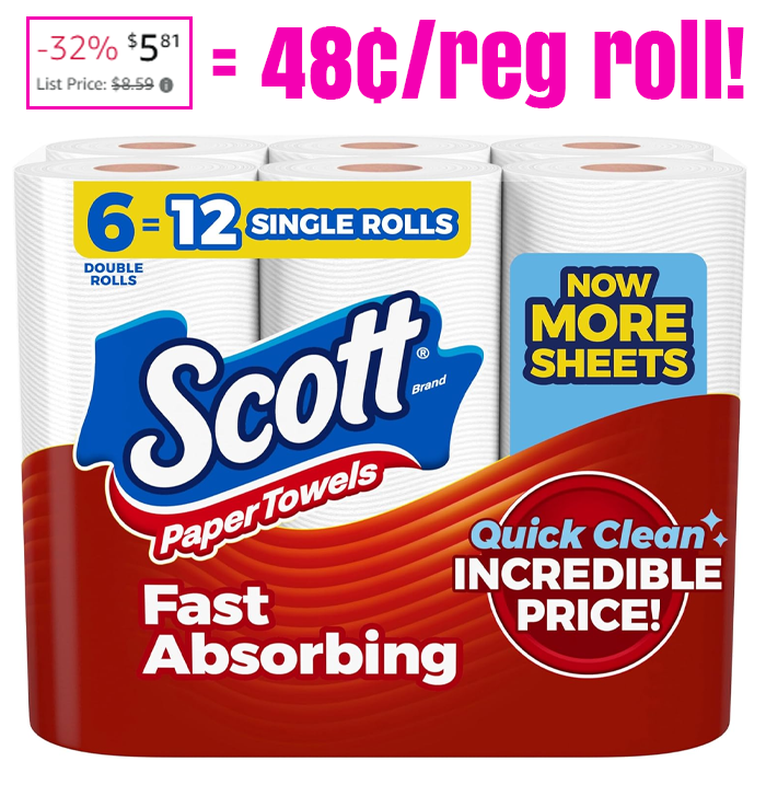 Scott Paper Towels, Choose-A-Sheet, 6 Double Rolls = 12 Regular Rolls for $6.84 (Reg $8.59)!
