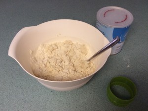 incorporated without any large chunks remaining. I typically do this until the shortening bits are about the size of a grain of rice. Add the milk and with the same fork turn over the ingredients until a mass is formed where most of the dry ingredients are incorporated. Turn out onto floured surface and knead the dough as few times as possible to incorporate the remaining dry ingredients. Roll the dough with a floured rolling pin to about a half inch thickness. Using a biscuit cutter (I use these), cut and place on a baking sheet. Re-roll out excess and cut and place on cookie sheet. (Makes about 15 biscuits)