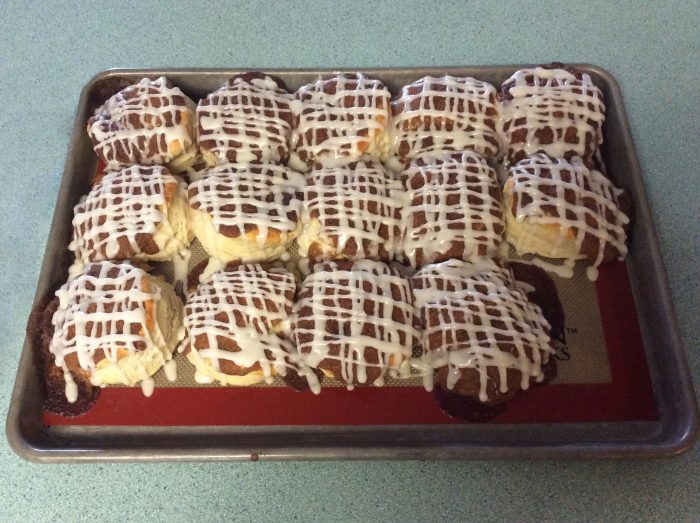 The recipe is in three parts; biscuits, cinnamon topping, and icing.