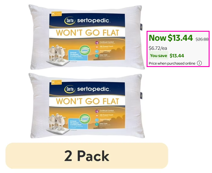 SertaPedic Won’t Go Flat King Pillow (2-Pack) for $13.44 (Reg $26.88)!
