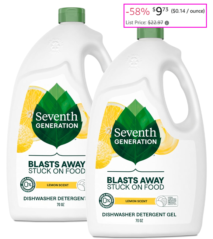 Seventh Generation Dishwasher Detergent Gel Lemon Scent, 70 oz, 2 pack for $11.45 (Reg $22.97)