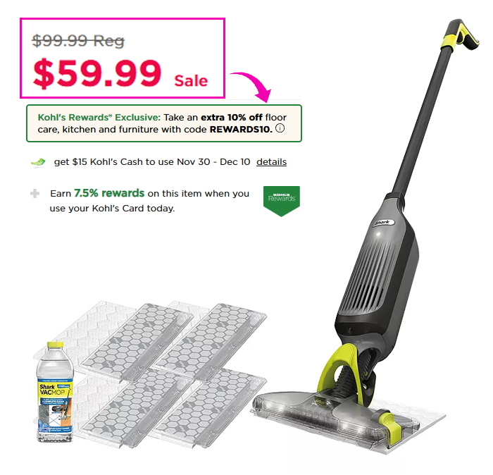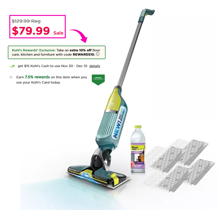 Shark® VACMOP Pro Cordless Hard Floor Vacuum Mop with Led Headlights, 4 Disposable Pads & 12-oz. Cleaning Solution for $53.99 + Earn $15 Kohl’s Cash (Reg $99.99)!