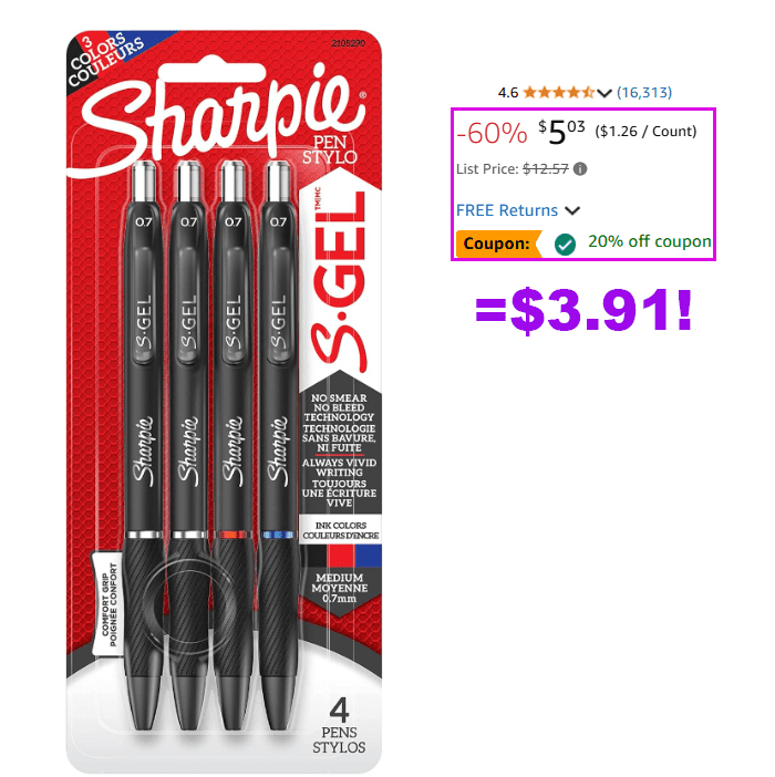 Sharpie S-Gel, Gel Pens, Medium Point (0.7mm), Assorted Colors, 4 Count for $6.59