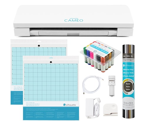 • ​Bundle includes: CAMEO 3 cutting machine, Silhouette Studio software, power cable and USB cable, two 12-inch cutting mats, autoblade cutting blade, sketch pen starter pack (24 pens total), and vinyl sampler pack – neutral (6 12×12” sheets)