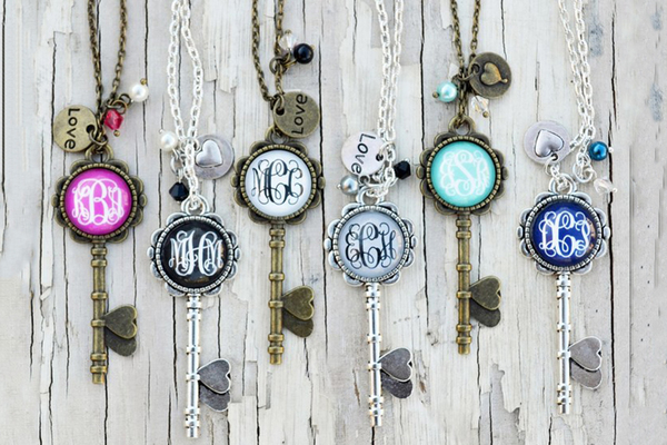 Add an ‘old world’ feel to your collection of accessories with this beautiful antiqued key necklace. Customized for you with your favorite colors and monogram.
