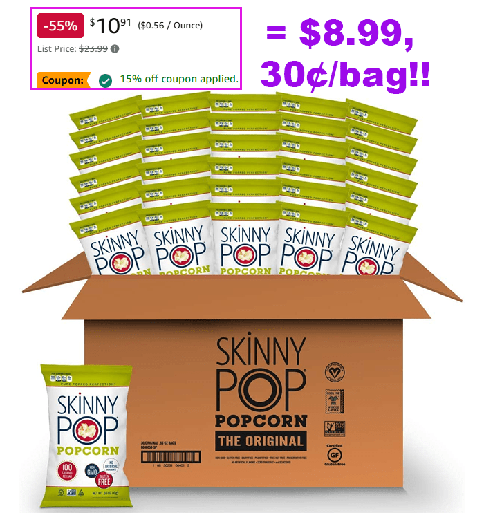SkinnyPop Original Popcorn Snack Bags, (Pack of 30) for $12.84 (Reg $23.99)!