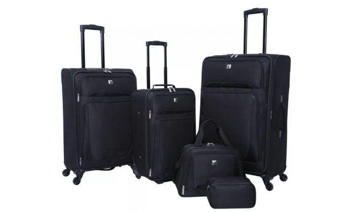 - 5-Piece Luggage Set includes a 28″ spinner suitcase, 25″ spinner suitcase, 21″ suitcase, travel tote and travel kit