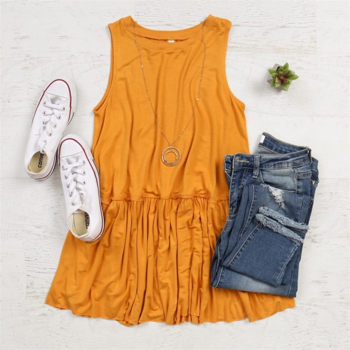 - Perfect for everyday fits, this sleeveless tunic is stylish and cute all at once! It features a peplum detail and a scoop neckline. It may become the most versatile piece in your wardrobe. No matter how you wear it, be sure to incorporate your unique style!
