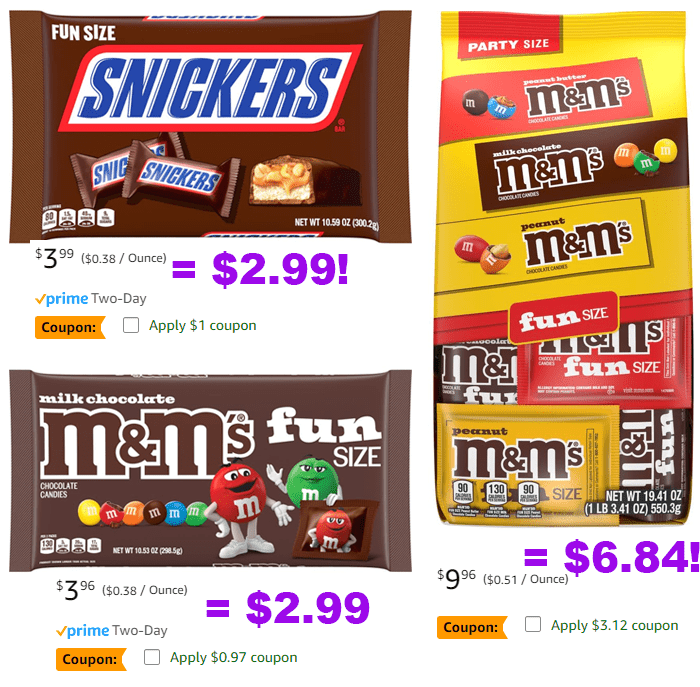 M&M’S Milk Chocolate, Peanut & Peanut Butter Fun Size Variety Pack, Party Size, 19.41 Oz Bulk Candy Bag for $9.96 – $3.12 e=coupon = $6.84 *NOTE: May arrive after Halloween, but it doesn’t have Halloween packaging at all, so you could save for Christmas or another event.