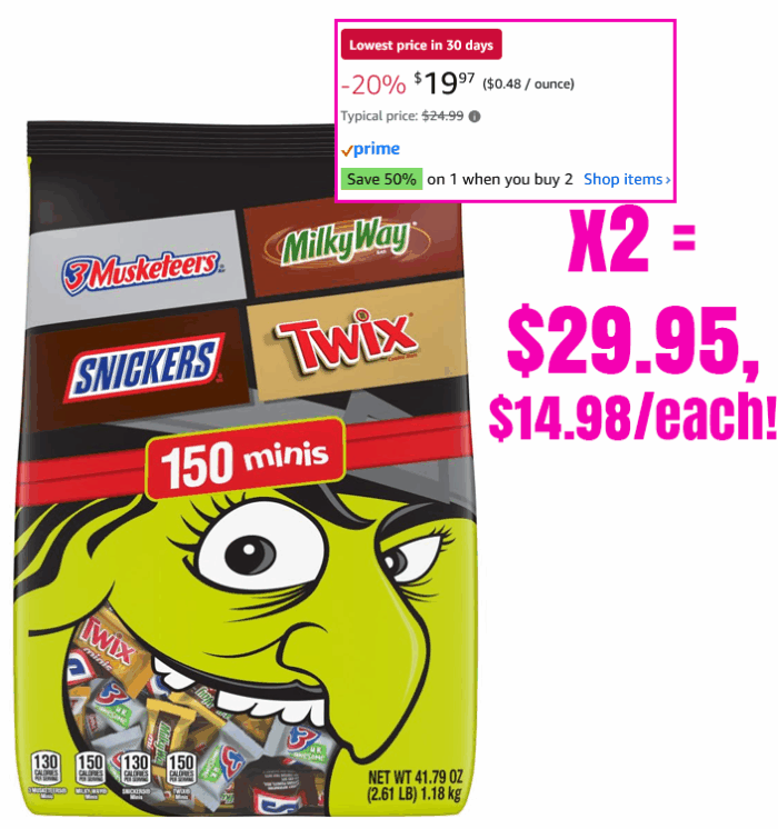 SNICKERS, TWIX, MILKY WAY & 3 MUSKETEERS Minis Halloween Candy Variety Pack, 150 Ct for $19.97 (Reg $24.99)