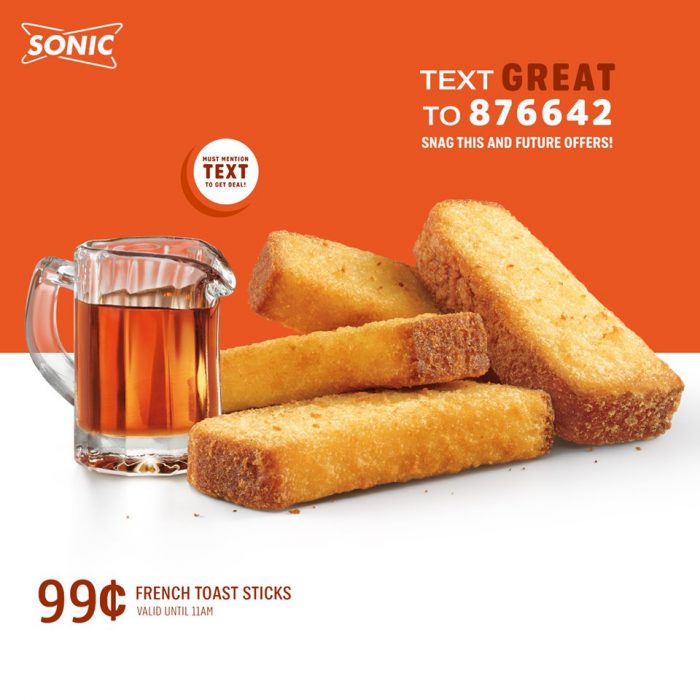 Each morning now through June 30th, until 11 AM each day, Sonic Drive-In is offering French Toast Sticks for just $0.99 (Reg $2.49) Each serving comes with 4 sticks and maple syrup!