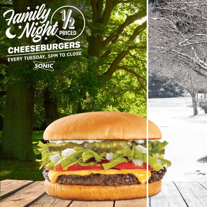 Seasons may change, but SONIC Family Night won’t. Grab ½ price Cheeseburgers EVERY Tuesday from 5pm to close. Lettuce be the cheese to your burger, come rain or shine. Offer valid 03/28/17 at participating SONIC Drive-Ins while supplies last.