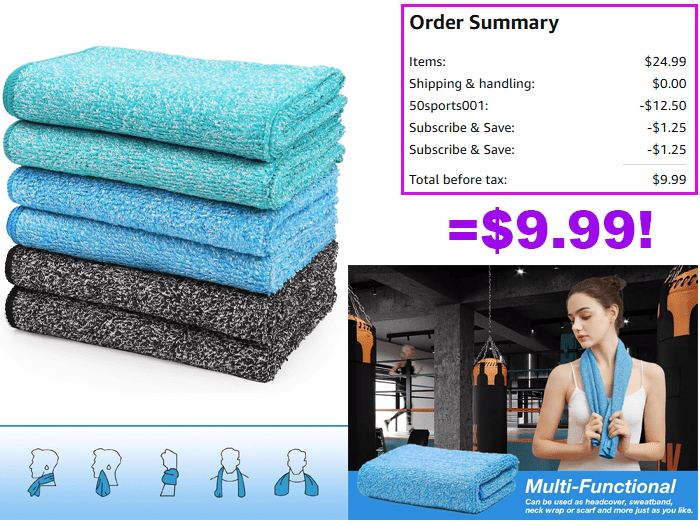 SOOWASH Quick Dry Negative Ions Microfiber Gym Towels, Pack of 6 for $24.99