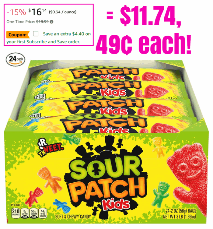 SOUR PATCH KIDS Soft & Chewy Candy, 24 – 2 oz Bags for $18.99