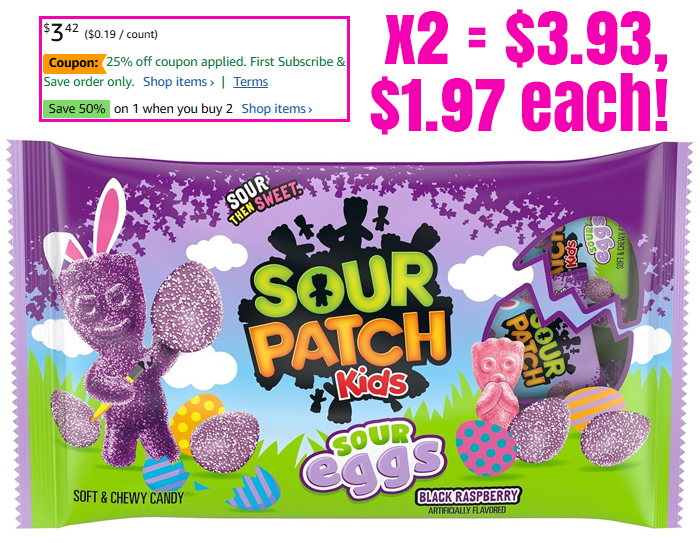 SOUR PATCH KIDS Sour Eggs Soft & Chewy Easter Candy, 18 Snack Packs for $3.42