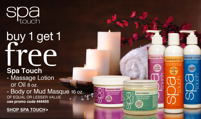 Until October 31st purchase any Spa Touch 8 0z. Massage Lotion or 16 0z. Body or Mud Mask and get another Spa touch product of equal or lesser value FREE! Use code 444455 at check out. Get FREE shipping when you spend $50.00 or more.