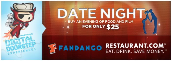 Date night, dinner and a movie from Saveology. Spend $25. and get 2 Fandango Movie Tickets and a FREE $50. Restaurant.com Gift Card. Visit Restaurant.com for a list of participating restaurants in your area.