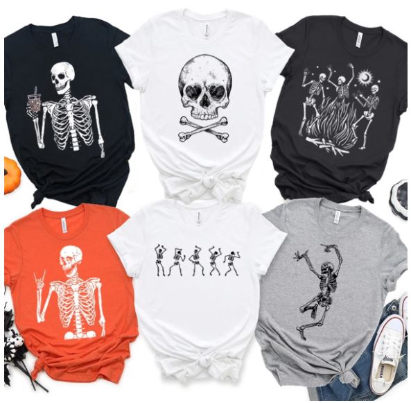Spooky season is here which means it’s the best time of year for graphic tees! These fun and unique skeleton designs are some of our favorite fall graphics of the season. They’re printed on ultra-soft and comfy Bella + Canvas tees and are perfect for everyday wear all season long. Available in both adult and youth sizes in a variety of colors!