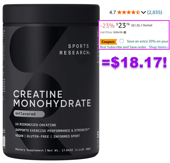 Sports Research Creatine Monohydrate, 1.1LBS for $27.95 (Reg $30.95)