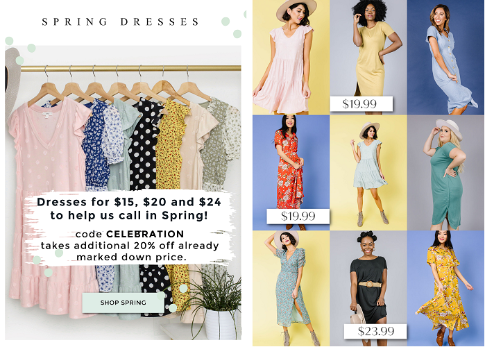 Spring Dresses just $15.99 – $39.99 (Reg. $29.99 – $59.99) *Use code CELEBRATION to get 20% off the listed prices!