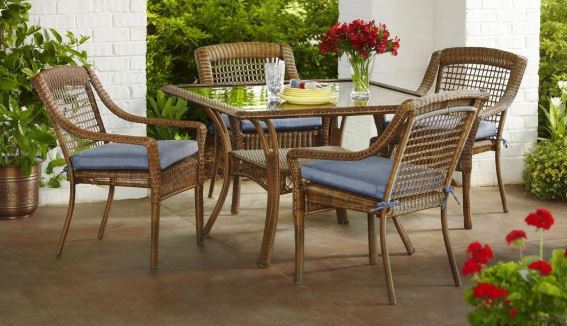 Hampton Bay Spring Haven Brown 5-Piece All-Weather Wicker Outdoor Patio Dining Set with Sky Blue Cushions $274.50 (reg $549)