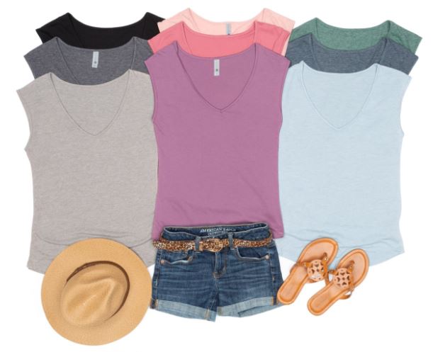 Here’s the perfect tee for summer! This sleeveless V-top is so versatile and has a great fit and style for any body type! Choose from 12 colors.