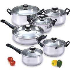 Prepare your own gourmet meals with these 12 stainless steel cookware set. The stainless steel pots and pans are suitable for all cooking sources; gas, electric or stove. The clear lid provides a clear view of your dishes while they are cooking or being served.