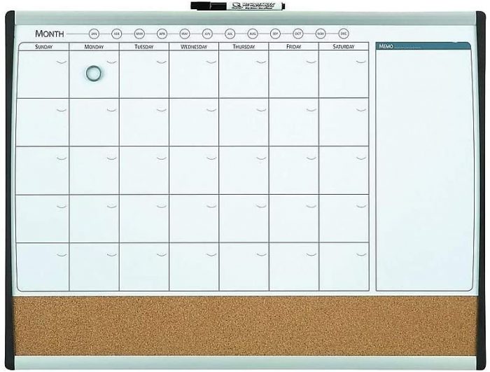 Stay on top of classes, meetings and other appointments with this dry-erase whiteboard and natural cork surface. This calendar board holds sticky notes, pictures and other important papers, while the compact construction helps it comfortably fit into any office, home or work-station. This Staples one-month-design black/silver-frame whiteboard comes with self-stick tape, letting you mount it onto the wall quickly.