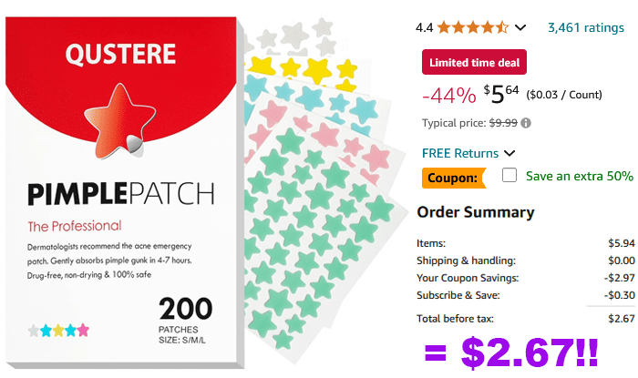 200-Count Star Shaped Hydrocolloid Pimple Patches with Tea Tree, Salicylic Acid & Cica Oil for $5.94 (Reg $9.99)