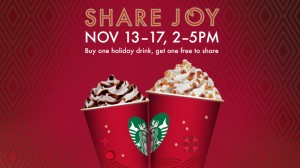 Stop in at a Starbucks between 2-5 pm on November 13-17 to get a FREE Holiday Drink when you purchase one!