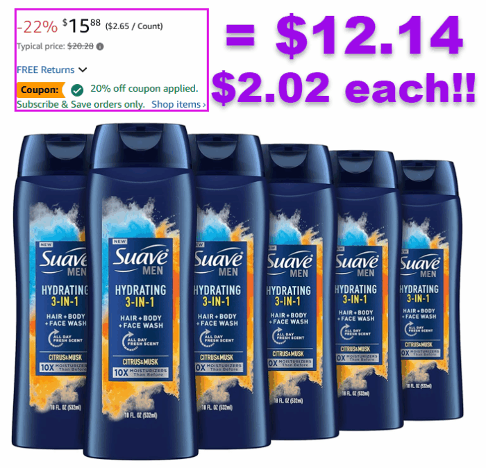 Suave Men Moisturizing Body, Face and Hair Wash, 3-in-1, 18 Oz Pack of 6 for $18.68 (Reg $20.28)!