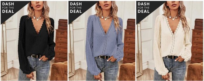 Featuring a plunging v-neckline, pretty Swiss dot pattern and lovely crochet trim, this top is a stunning addition to your casual wardrobe. Grab it now while it’s on this fabulous sale price through early tomorrow morning!
