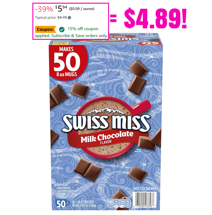 Swiss Miss Milk Chocolate Flavor Hot Cocoa Mix, 1.38 oz. 50-Count for $4.89 (Reg $9.78)!