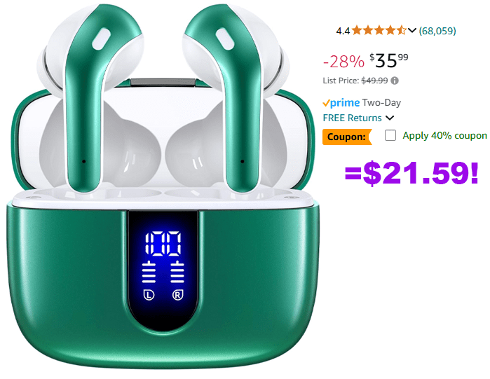 TAGRY Bluetooth True Wireless Earbuds, 60H Playback, Wireless Charging Case, IPX5 Waterproof for $35.99 (Reg $49.99)!