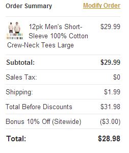 One of the deals is for this 12 pack of Men’s Short-Sleeve 100% Cotton Crew-Neck Tees for $26.99 after the code. Shipping is $1.99, so the total comes to $28.98, which is just $2.42/shirt! What a sweet deal!