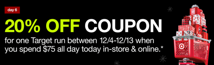 Today only at Target (in-store or online), when you spend $75 in one purchase (after all discounts), you’ll receive a 20% off coupon to be used in a single purchase between December 4-13!