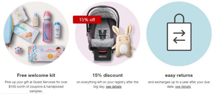 If you’re expecting a baby, make sure you register with the Target Baby Registry! In addition to getting 15% off anything left on your registry after baby is born, you’ll get a FREE welcome kit with over $100 worth of coupons and samples!