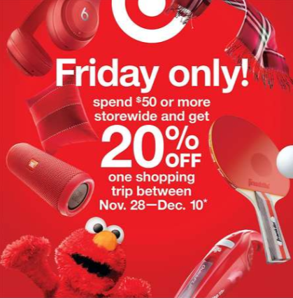 *Your $50 purchase must be made in a single transaction in stores on 11/24/17 between 12:01am local time and store close, or online 11/24/17 starting at midnight PST until 11:59 pm PST. Qualifying online guests will receive coupon via email on 11/25/17. Target reserves the right to cancel coupon if the online order is cancelled. The $50 qualifying purchase will be calculated after all other discounts are applied. CVS pharmacy, clinic and Target Optical are excluded from qualification. Limit one 20% off coupon per guest. Some exclusions apply; see coupon for details