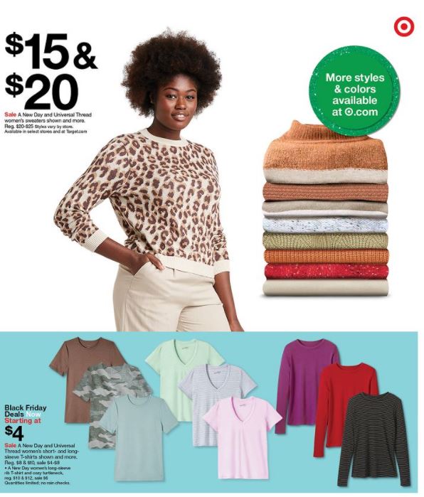 Select A New Day and Universal Thread women’s sweaters $15.00 & 20.00 (reg $20-$25)